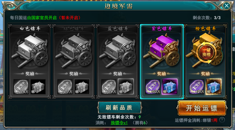 2、在点击接镖之后,我们可以点击换镖,消耗换镖令来刷新镖车的品质,品质越高的镖车对应着更丰厚的奖励,点击换镖之后镖车的品质只会提升不会下降,所以放心大胆地换吧。在换镖完成之后,我们只要点击“开始运镖”,便可以开始运镖的部分了
