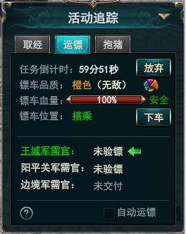 2、在我们接取镖车之后,镖车会跟随在我们身后,整个运镖过程有60分钟的时间限制,超过这个时间则会运镖失败,不过一般情况下运一趟镖很快,是不会超过这个时间限制的,我们需要在沿途两个军需官处依次验镖,然后再把镖车交给最后一个检查点的军需官才能完成运镖,点击军需官的名字可以自动寻路到军需官的位置,到达运镖地点后,需要与军需官对话才能完成验镖