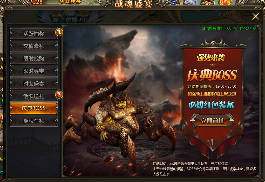 活动规则:活动指定时间会刷新超级大BOSS,玩家击杀BOSS可拾取大量钻石、元宝和高阶红色装备,拾取为无归属拾取,所有人都可以捡