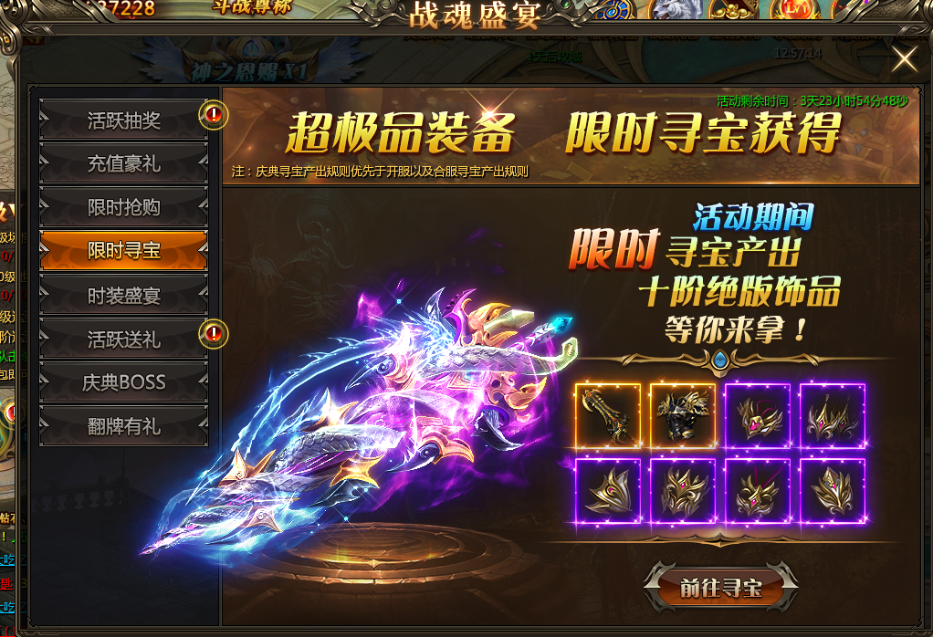 活动规则:活动期间寻宝库会加入绝版十阶饰品装备,这批装备只会投放在限时寻宝上,机会难得