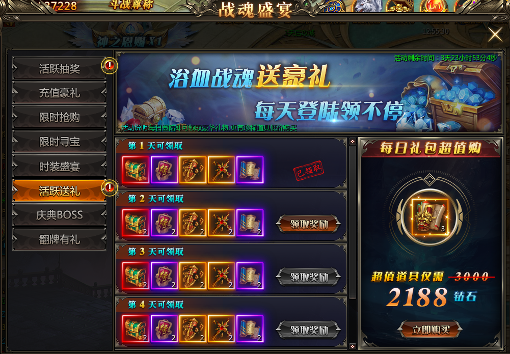 3. 活跃抽奖(登录,活跃击杀BOSS,每日充值可获得抽奖次数)