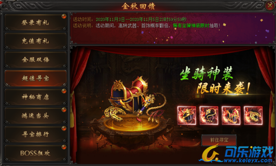 活动说明:活动期间,高转武器、首饰概率翻倍,坐骑神装限时抽取!