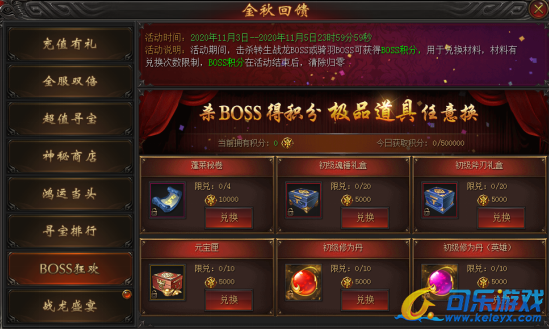 活动说明 : 活动期间内,击杀BOSS获得“boss积分”,“boss积分”可用于兑换材料,每种材料均有兑换次数限制,“boss积分”在活动结束后,清除归零