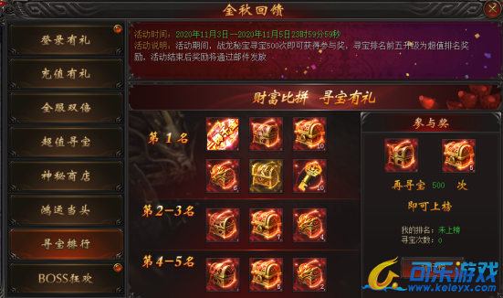 活动说明:活动期间,战龙秘宝寻宝500次即可获得参与奖,寻宝排名前五升级为超值排名奖励,活动结束后奖励将通过邮件发放。”