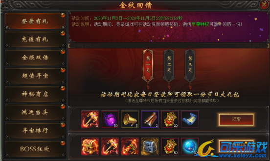 活动说明:活动期间,每日登录游戏可领取奖励,激活至尊特权可额外领取一份!