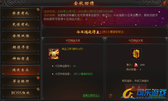 活动说明 : 玩家每消耗1988龙钻即可获得一个1-100之间的幸运数字。每日21点抽取今日幸运数字,拥有该数字的玩家即可获得今日鸿运大奖。