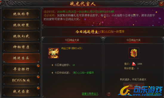 活动说明 : 玩家每消耗1988龙钻即可获得一个1-100之间的幸运数字。每日21点抽取今日幸运数字,拥有该数字的玩家即可获得今日鸿运大奖。