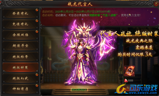 活动说明 : 活动期间,可在活动界面购买绝版时装“代言人战袍”,使用后永久生效。