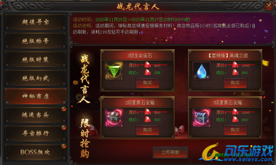 活动说明 : 活动期间,神秘商店倾情促销稀有材料!商店物品每2小时自动刷新(或全商品全部已购后),消耗199龙钻可手动刷新。