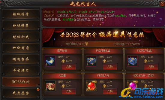 活动说明 : 活动期间内,击杀BOSS获得“boss积分”,“boss积分”可用于兑换材料,每种材料均有兑换次数限制,“boss积分”在活动结束后,清除归零