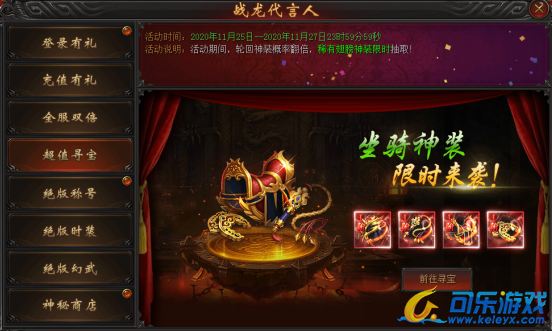 活动说明:活动期间,轮回神装概率翻倍,坐骑神装限时抽取!