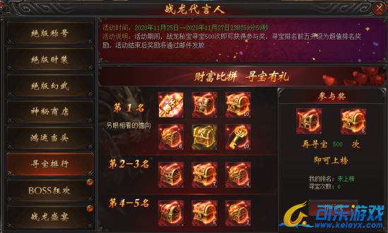 活动说明:活动期间,战龙秘宝寻宝500次即可获得参与奖,寻宝排名前五升级为超值排名奖励,活动结束后奖励将通过邮件发放。