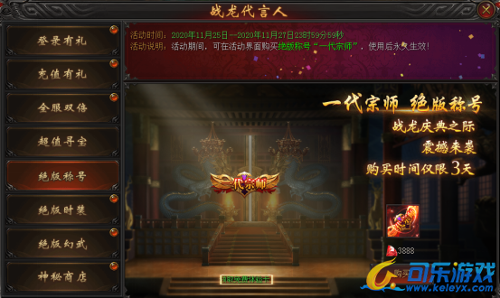 活动说明 : 活动期间,可在活动界面购买绝版称号“一代宗师”,使用后永久生效。