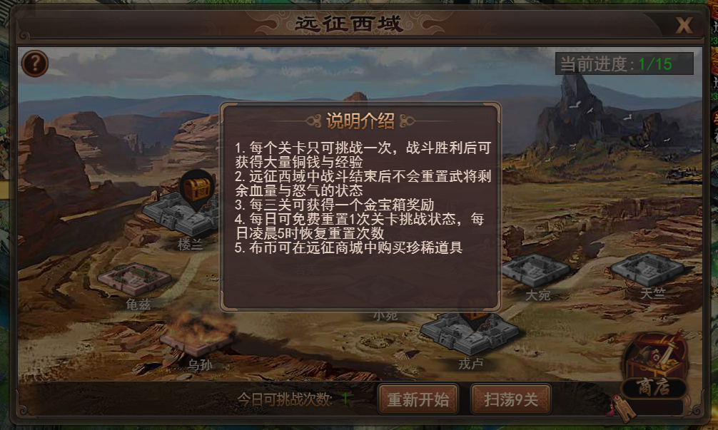 所有关卡均挑战完毕后本次远征通关,不可再进行挑战。点击重新开始可重置关卡挑战状态,系统每日会赠送1次免费重置机会。VIP玩家可获得额外消耗元宝重置的机会。