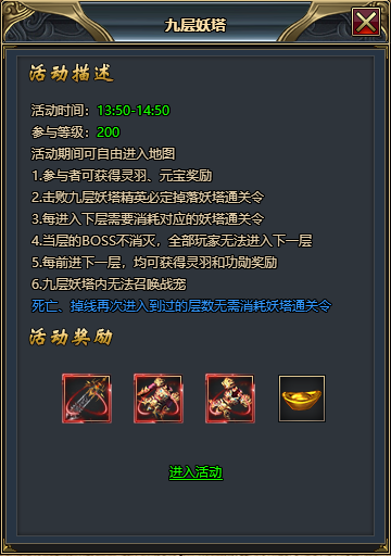 当玩家等级达到200级时可在九层妖塔活动时间通过九层妖塔NPC进入九层妖塔