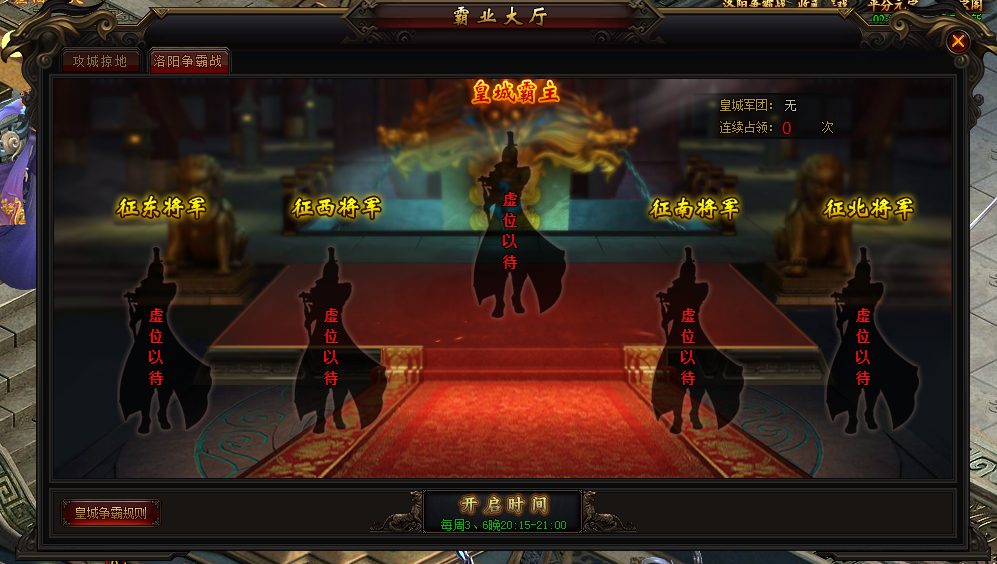 开服5天及开服后的每周3、6的20:15开启洛阳争霸战,军团排名前三的军团可以前往洛阳争夺归属权
