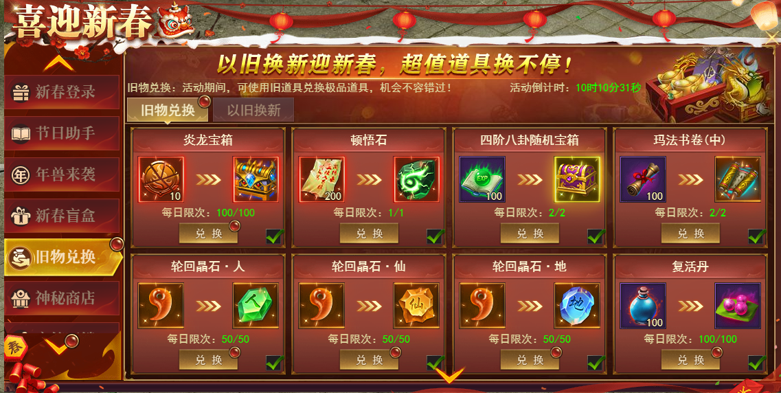 旧物兑换-可以用多余的道具在商城里兑换成需要的道具,每日兑换次数重置,机会不容错过!