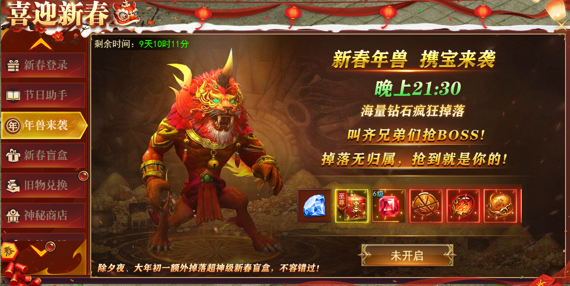 活动期间,晚上21:30开启年兽来袭,海量钻石道具疯狂掉落。掉落无归属,抢到就是你的!