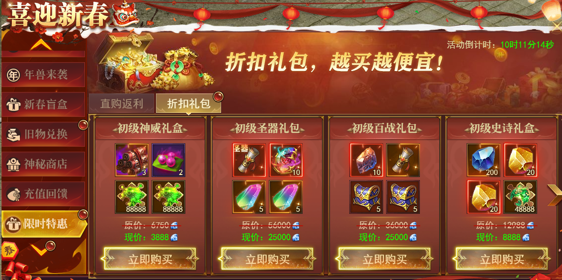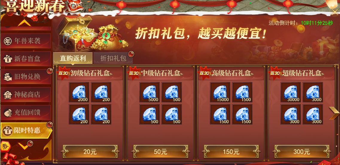 活动期间钻石等各种道具,超高返利、超低折扣,越买越便宜!