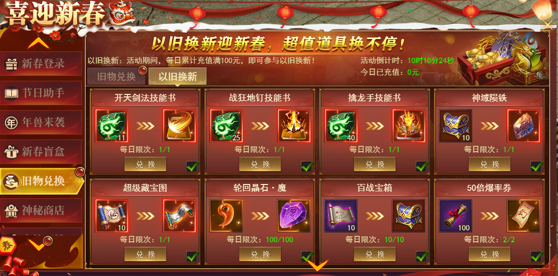 以旧换新-每日累计充值满100元即可在商城里兑换更珍贵的道具,超划算哦!