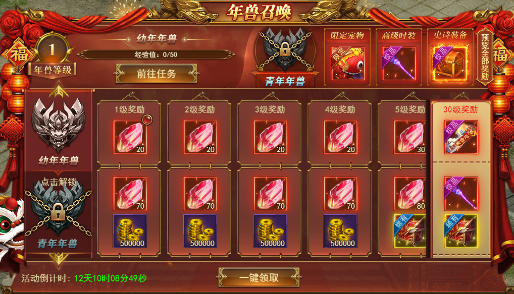 完成任务即可获得年兽经验是年兽成长,每一级可以领取相应的奖励,更有大奖等您来拿。激活青年年兽成长奖励更丰富。