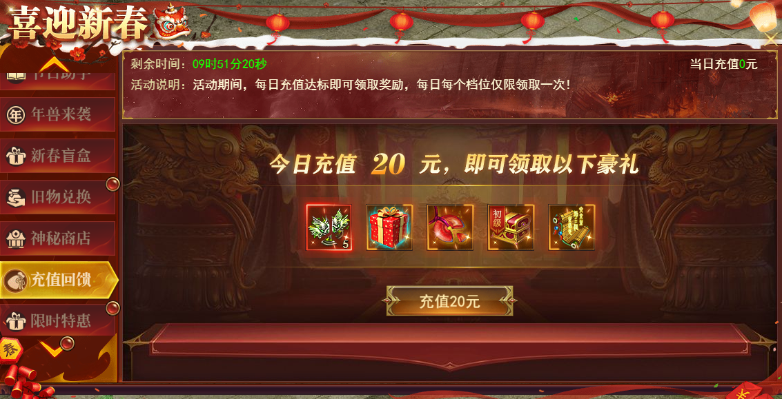 活动期间每日充值达标要即可领取奖励,每日每个档位仅限领取一次。