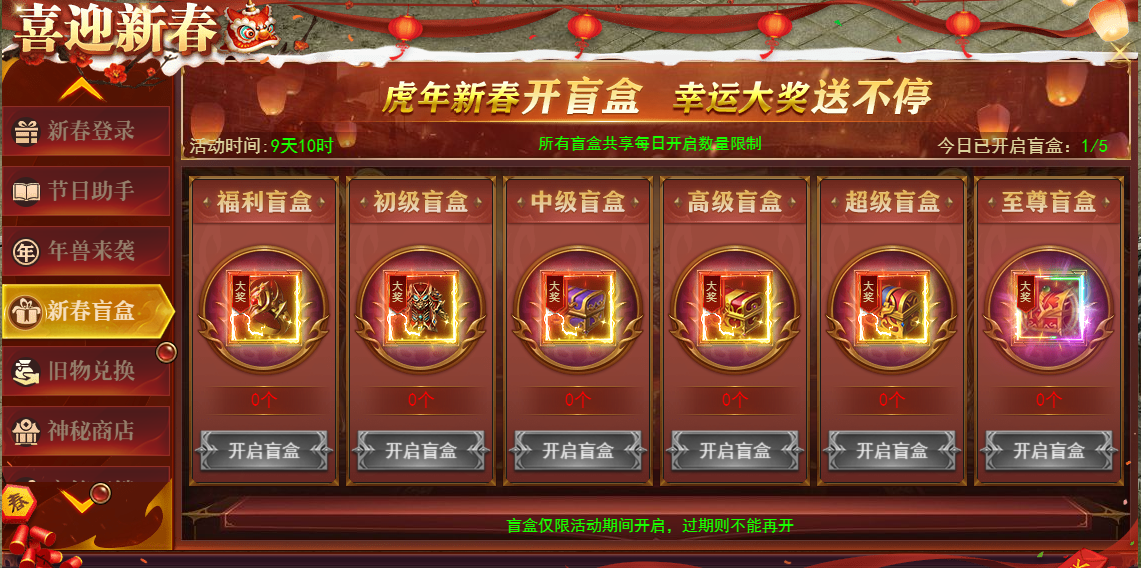 活动期间参加新春活动可以获得各种盲盒,开启盲盒可以获得各种奖励,每日可开启5个盲盒,每个盲盒开启后可以翻牌4次,开启至尊盲盒奖励更丰厚。