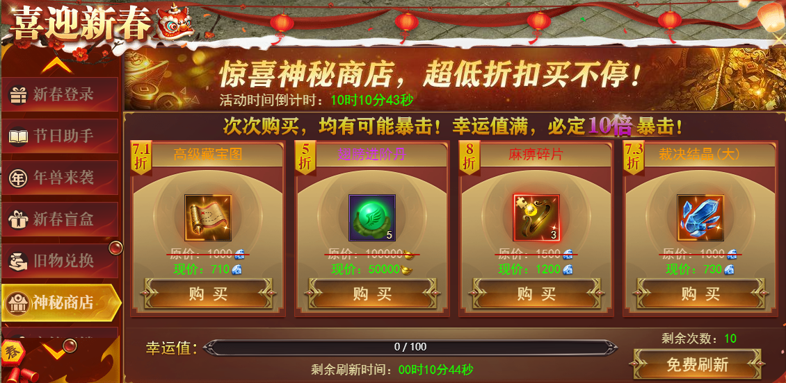 各种珍贵道具超低折扣出售,每次购买均能获得幸运值,幸运值满后购买,必定10倍暴击获得的道具数量。