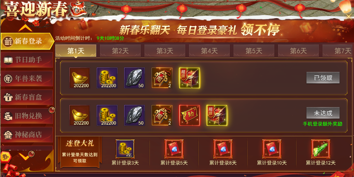 活动期间每日登录可领取一份登录奖励,手机登录可以额外领取一份,还可以获得节日助手激活卡。(手机端或手机浏览器网址登录都可以领取)