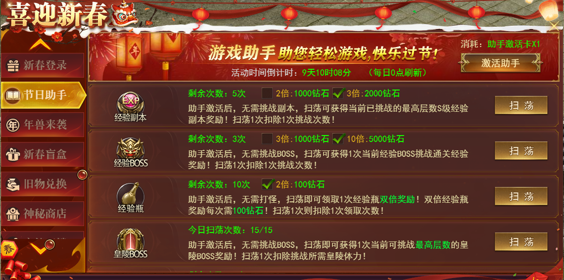 活动期间每天手机登录游戏都可免费获得节日助手激活卡,激活后能快速完成日常任务。