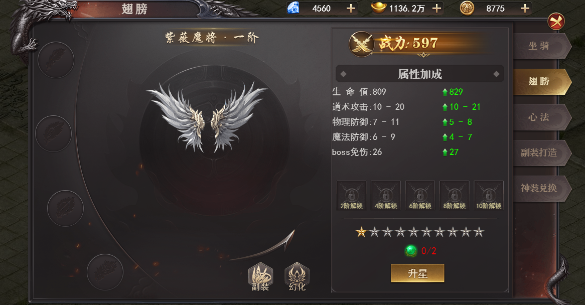 翅膀升星可改变翅膀的外观和加强角色属性收益