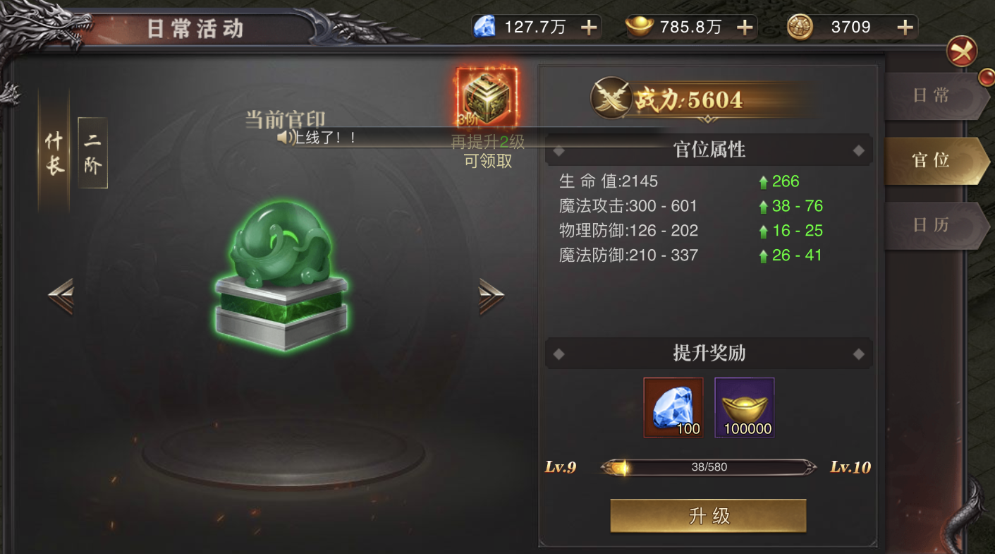提升官位等级可领取官位装备,穿戴后不仅降低PK中受到的伤害还可大幅提升角色属性
