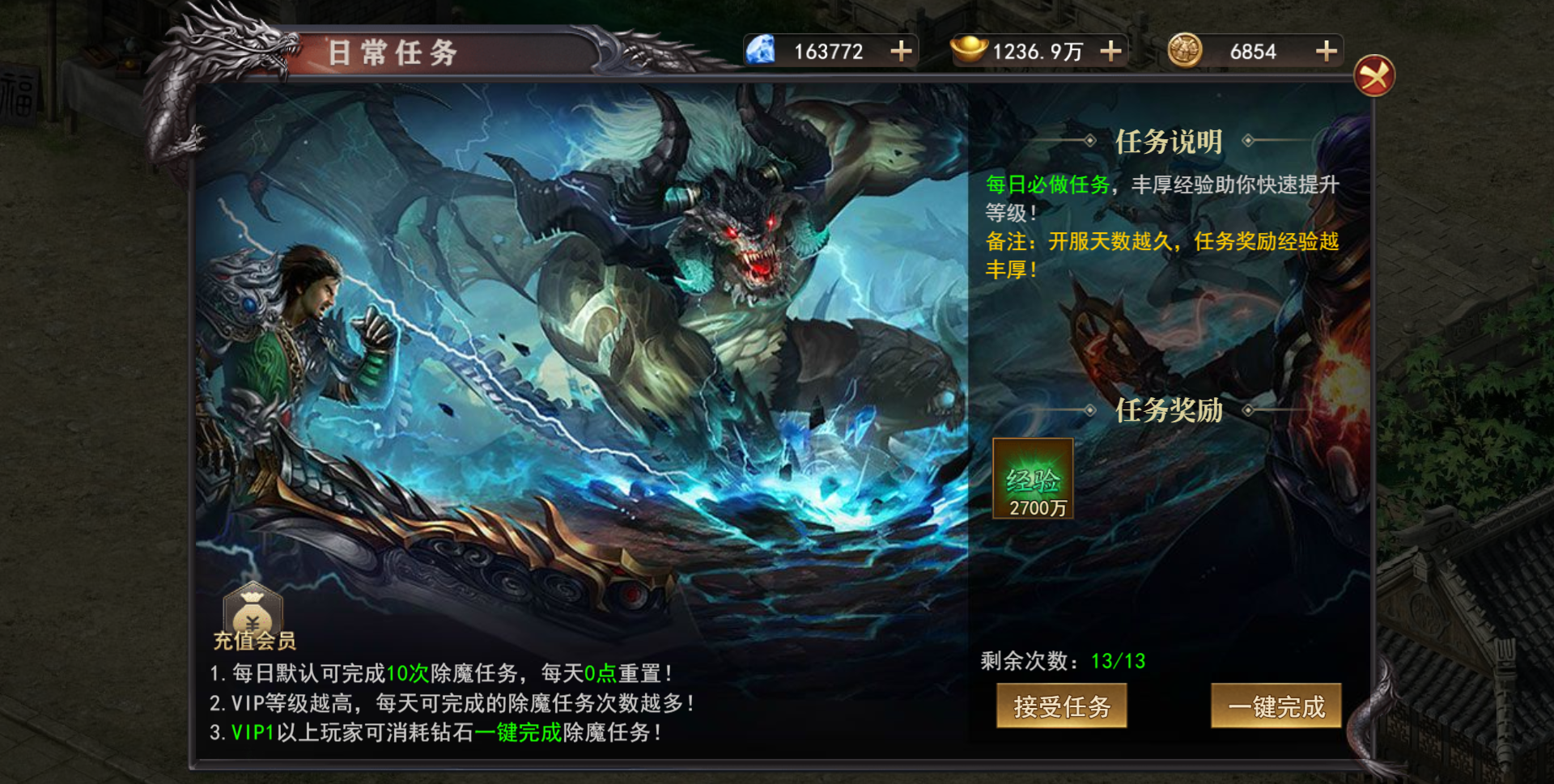 玩法简介:除魔任务可产出大量游戏经验。玩家每天默认有10次完成任务次数。提升vip等级可额外增加每日完成次数。消耗钻石可一键完成!