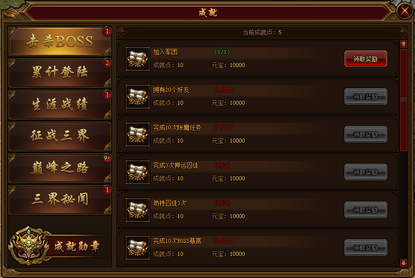 完成对应的成就内容(升级,击杀BOSS,等等)会完成成就获得成就积分和对应的元宝奖励