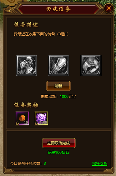 回收任务在主城124,191处刷新或者完成,完成目标:需要收集任务NPC给出的三件中的任意一件可领取奖励,刷新所需双倍只需要消耗元宝