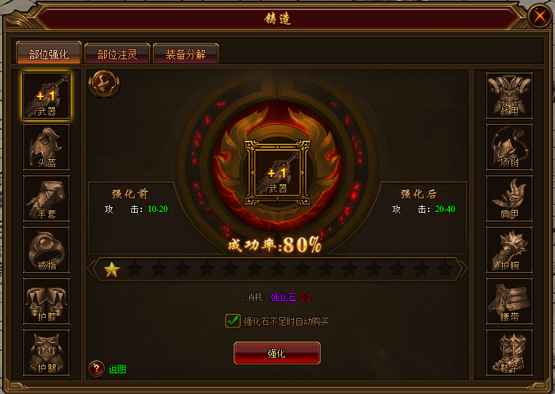 角色通过消耗元宝和强化石或超级强化石对该装备位进行强化强化装备可提升角色属性;更换装备不影响强化装备带来的角色属性。