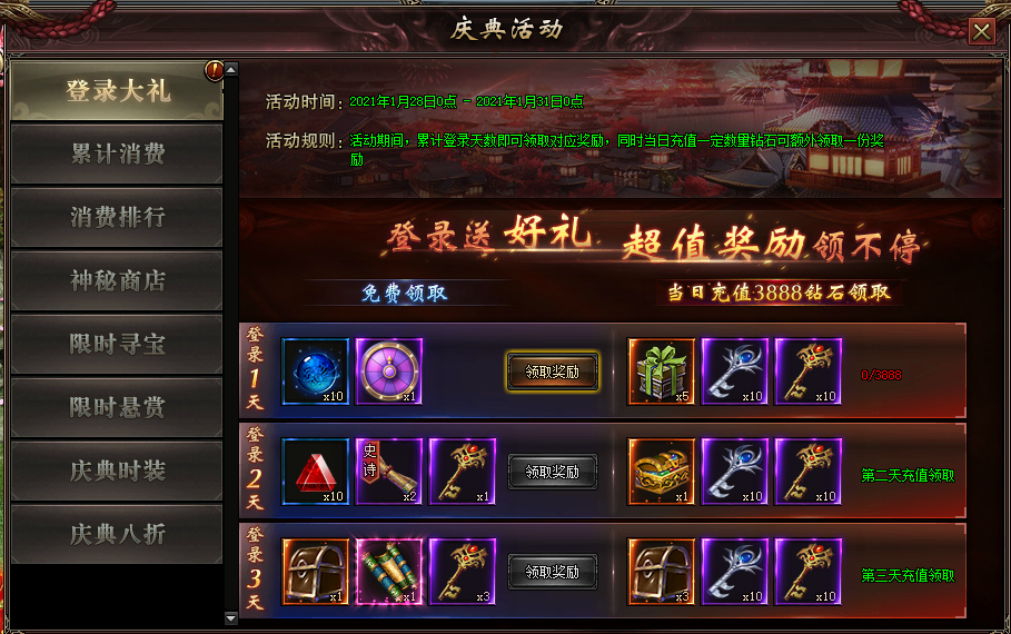 活动规则:活动期间每天登录即可免费领取超值奖励;累计登录满3天可免费领取极品大奖!同时每天充值一定钻石还可以额外领取一份超值豪华奖励。