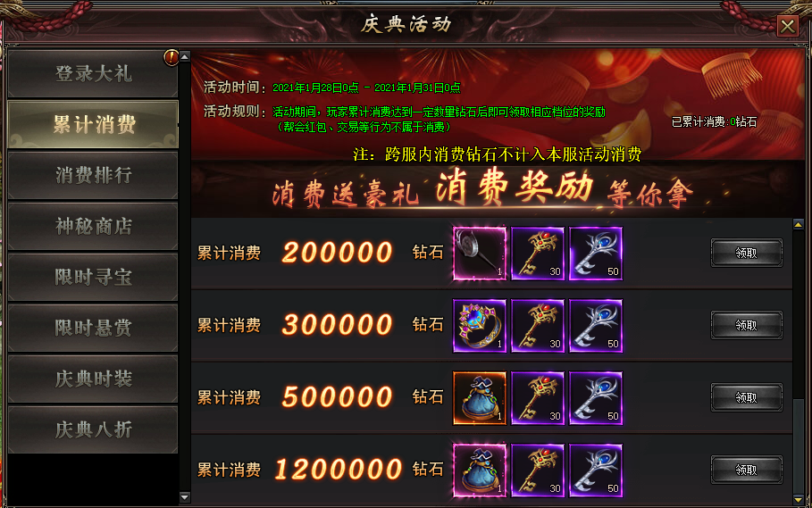 活动规则:活动期间累计消费钻石达到对应数量,即可免费领取对应奖励
