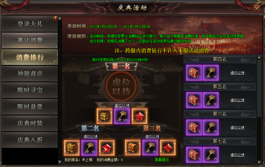 活动规则:活动期间,累计消费达到指定额度钻石,即可参与排行,第3天活动结束时根据排名,前10名获取排行奖励,奖励以邮件进行发放
