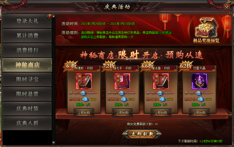 活动规则:玩家可从神秘商店购买各种市面上难以获取的珍贵物品,奖励每2小时自动刷新1次,期间玩家还可自主刷新选择购买
