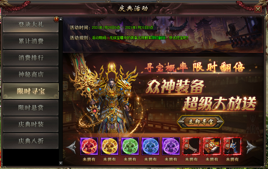 活动规则:活动期间在龙之宝藏中寻宝,主装抽取概率翻倍,同时还可抽到魔法盾铭文、荣耀装备装等极品装备!