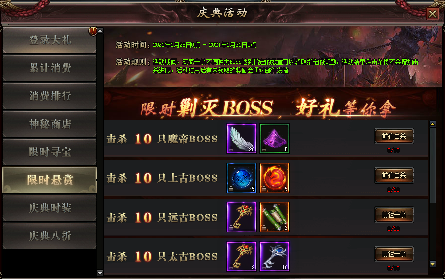 活动规则:根据击杀对应阶段的BOSS数量领取奖励