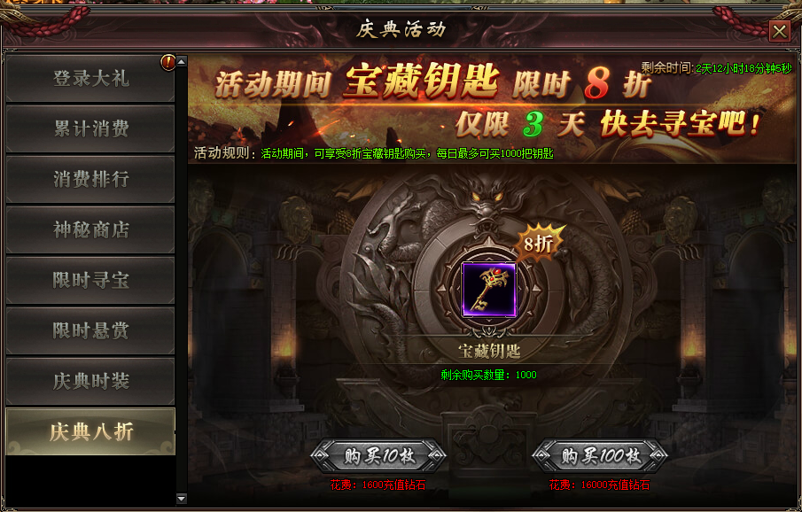 活动规则:活动期间,所有玩家可享受极低折扣购买宝藏钥匙参与挖宝活动