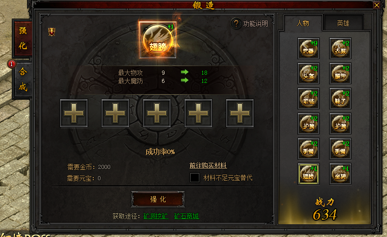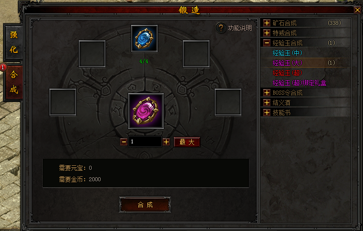 合成,可以合成特戒、BOSS令、经验玉,矿石,技能书残页(专属技能升级)5种道具,只要收集足够的道具后,就可以在这里进行合成,合成需要消耗金币。