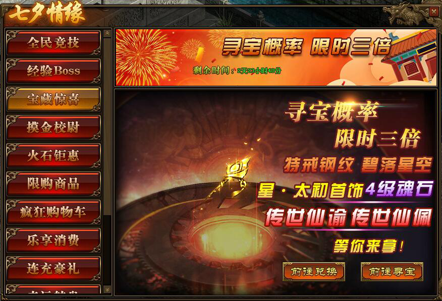 1.活动期间,玩家寻宝概率翻倍,极高几率获得星·太初首饰,仙元石、碧落星空,三级天魂石、四级天魂石,传世灵器·仙谕以及传世灵器·仙佩