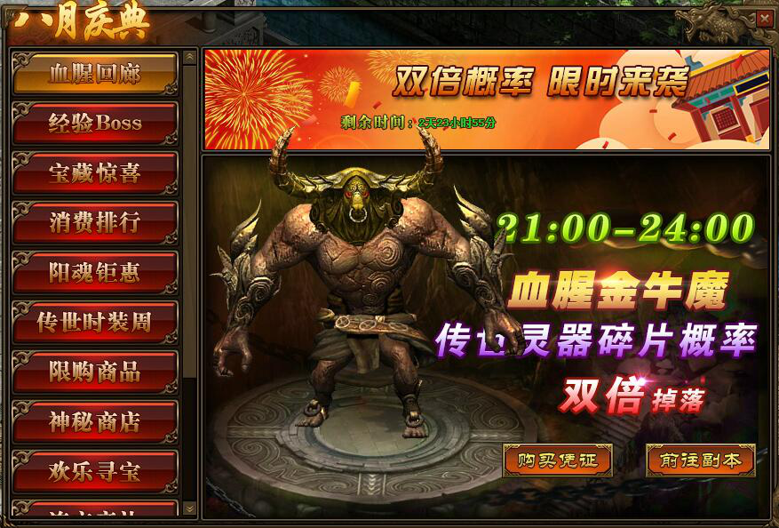 1.活动期间,玩家参与“多人副本-血腥回廊”,获得“传世灵器碎片”的概率翻倍;