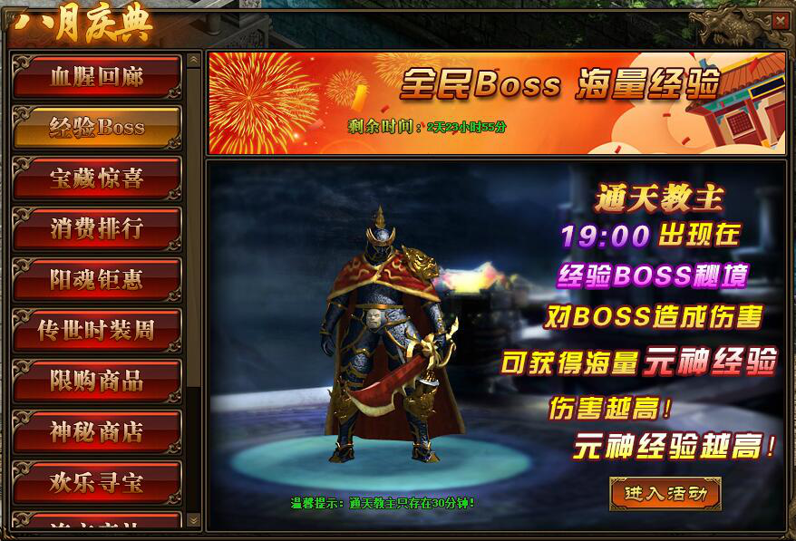 2.活动中,玩家对BOSS造成的伤害,将在活动结束后转换成元神经验并发放;