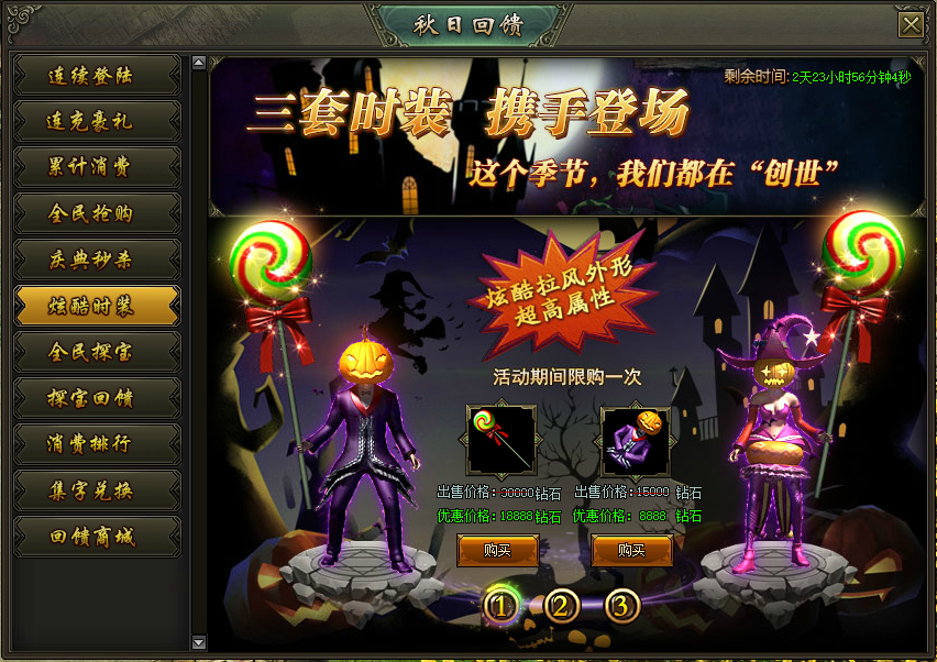 活动说明:活动期间,绝版时装限时出售,炫酷拉风外型、超高属性都在这里!