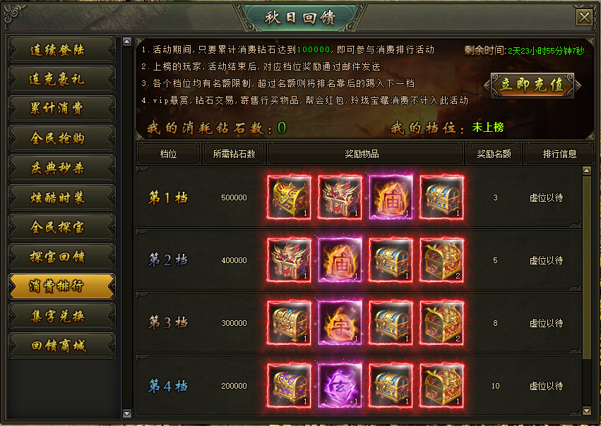 活动说明:活动期间,累计消费达到100000钻石的玩家参与排行,达到对应档位的玩家奖励在活动结束后以邮件的方式进行发放