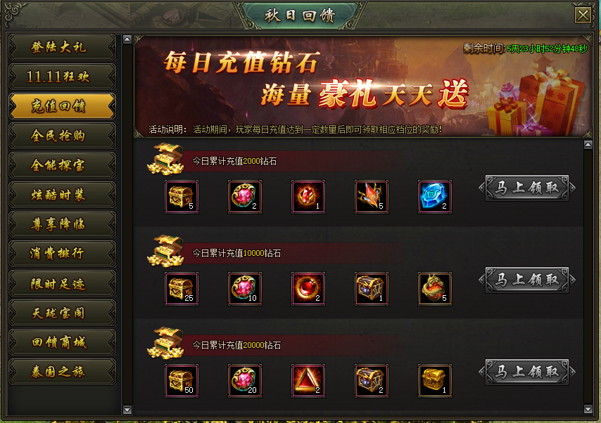 活动说明:活动期间,每日充值达到指定额度即可领取相应档位的奖励